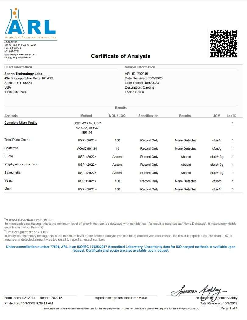 All Sports Technology Labs SARMs are third-party tested by MZ Biolabs, an independent laboratory based in Arizona. Each batch is packaged and tested in the USA to ensure accuracy and purity. Our Certificates of Analysis confirm that products meet the listed specifications: