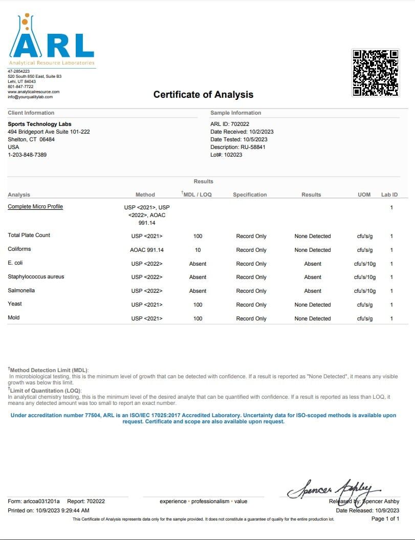 Each batch is bottled and tested in the USA to ensure accuracy and purity. Our Certificates of Analysis confirm that products meet the listed specifications: