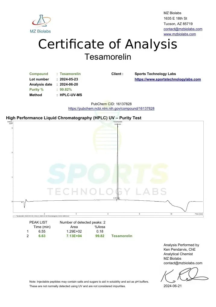 The purity of Tesamorelin is verified through high-performance liquid chromatography (HPLC) testing conducted by accredited US laboratories. Each batch is accompanied by a Certificate of Analysis (COA).