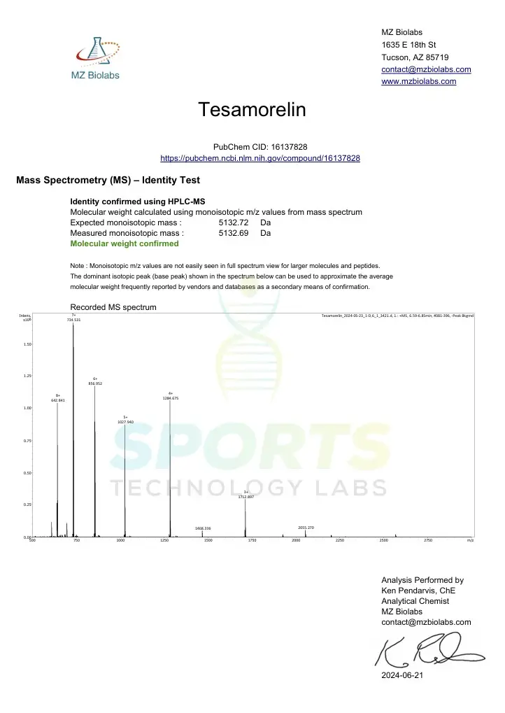 All Sports Technology Labs peptides are third-party tested by MZ Biolabs, an independent laboratory based in Arizona. While not bottled in the USA, every batch is tested here to verify accuracy and purity. Our Certificates of Analysis confirm that products meet the listed specifications.