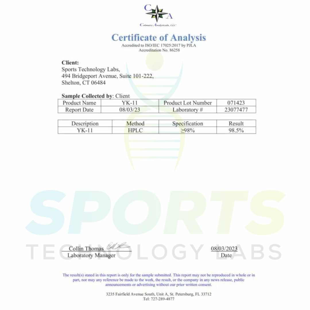 Significant quality control problems have been documented in the unregulated research chemical market for YK-11. A 2024 study found that many products marketed online as YK-11 contained undeclared or unapproved active substances, manufacturing contaminants, or incorrect dosages, posing potential health hazards. Because most YK-11 products are sold under “for research purposes only” labels, vendors avoid stricter regulatory oversight by not placing updated COA’s on their website. At Sports Technology Labs, we emphasize transparency in every batch. A full list of COA’s can be found on every product page.